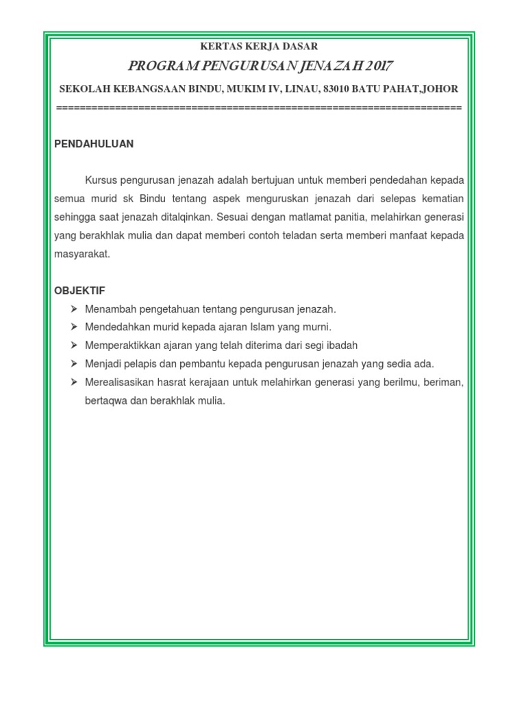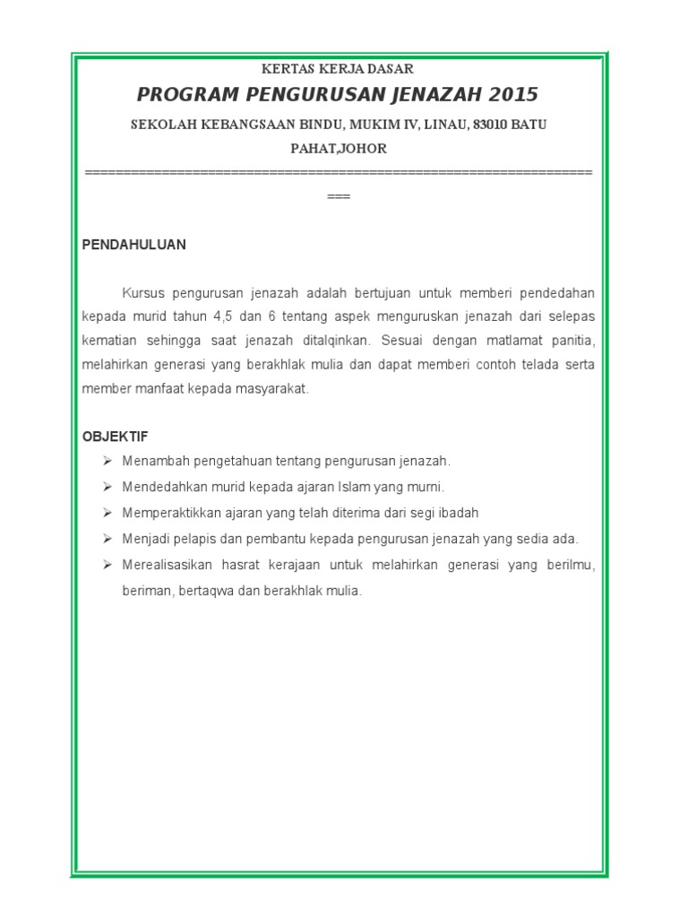 Pengertian jenazah jenazah (mayat atau jasad) adalah orang yang telah meninggal dunia. Lm 2025 bahasa melayu kerjaya perniagaan tema. Sk usj 20 skk kursus pengurusan jenazah 22 jun 2015 borang rumusan penilaian program bulatkan pada yang. Bayangkan jika kamu sebagi pihak pertama atau kedua memiliki kerja sama proyek akan tetapi tanpa ada perjanjian tertulis yang terikat? Home info guru 83 contoh kertas kerja program sekolah. Bahasa melayu kertas 1 21 disember 2020. Kertas kerja pengurusan jenazah 2007. Menguruskan jenazah adalah merupakan perkara yang tidak boleh kita elakkan begitu sahaja. 7 contoh surat pengalaman kerja. Kertas kerja program peningkatan akademik. Tugas ini dibuat untuk memenuhi syarat mata pelajaran pai. Contoh email perpisahan kerja yang terakhir adalah untuk semua rekan kerja lainnya, misalnya saja vendor yang pernah berhubungan dengan anda. Use the download button below or simple online reader.