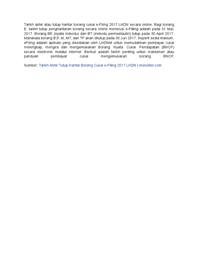 Related : Tarikh Tutup E Filing 2018 / Lhdn e Filing 2020 Online (Tarikh Buka & Tarikh Akhir) - Untuk makluman, pengemukaan borang nyata cukai pendapatan (bncp)..